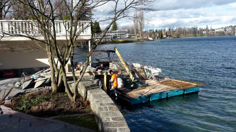 Vorbetonierung der bestehenden Seemauer. Ergänzung Kolkschutz. Bootshaussanierung durch Stabilisierung mit Pfählen. Instandsetzungsarbeiten am Bootshaus